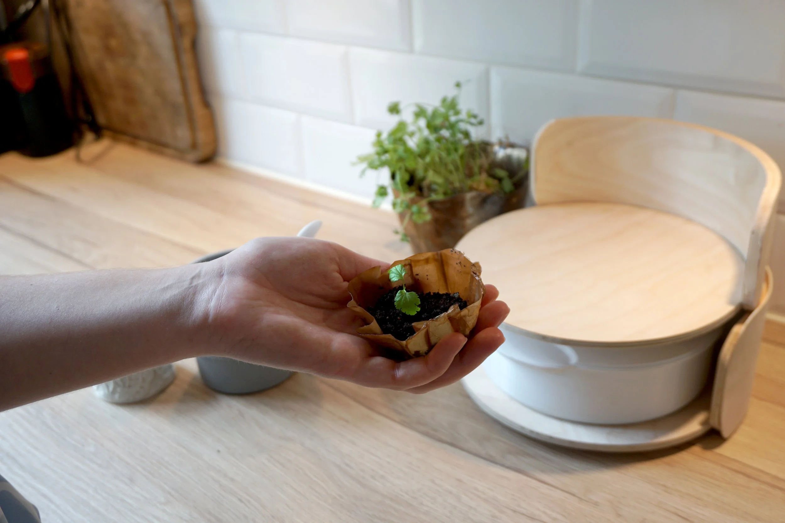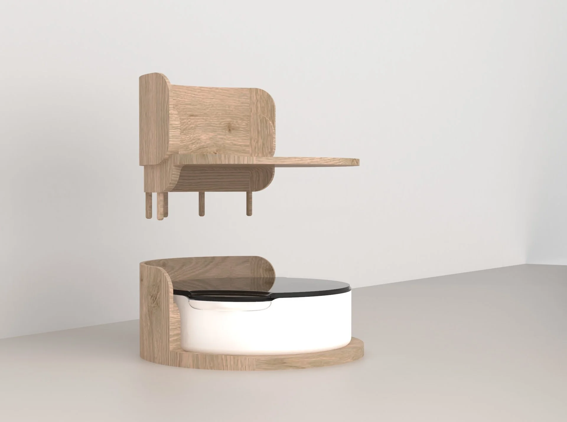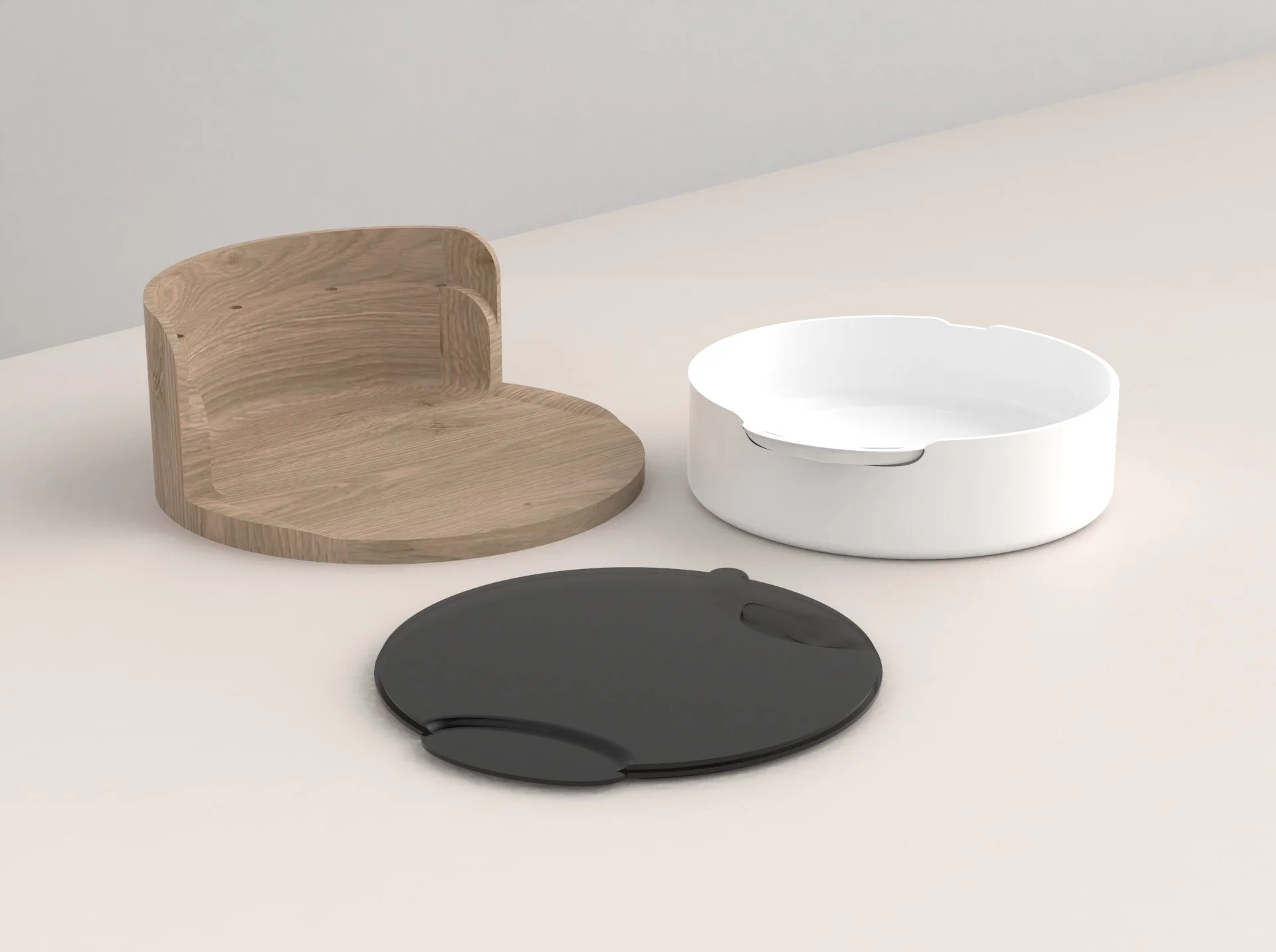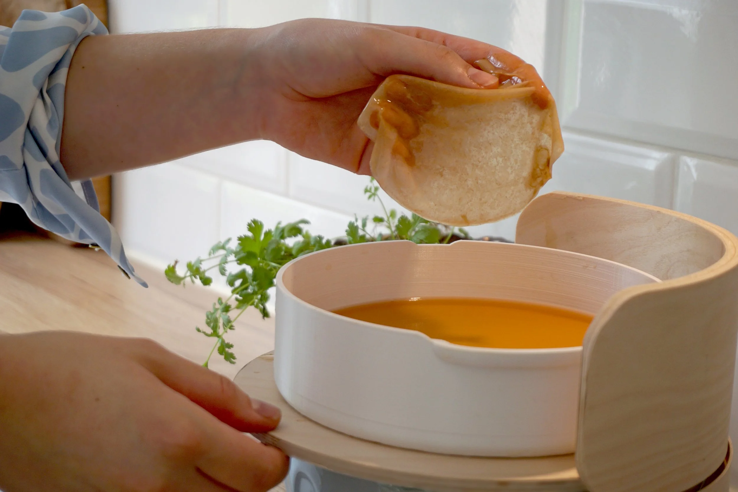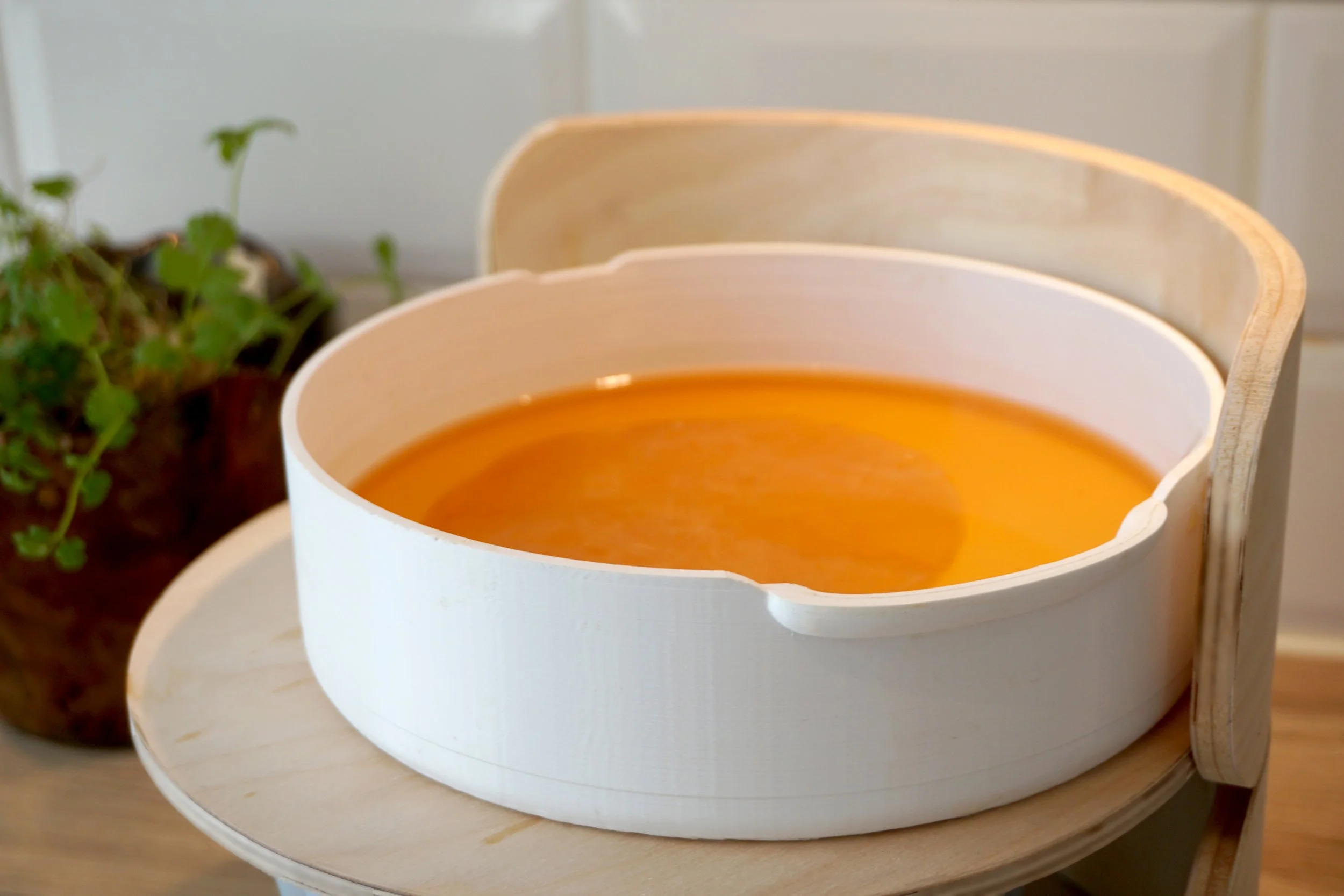 The main station is 95 mm tall, and the vessel is Ø200 mm. The Scoby grows the same size, but it shrinks to Ø180 mm when it is dried. The Scoby has been used for hundreds of years, and now people are still using it to brew kombucha or experimenting with its abilities.