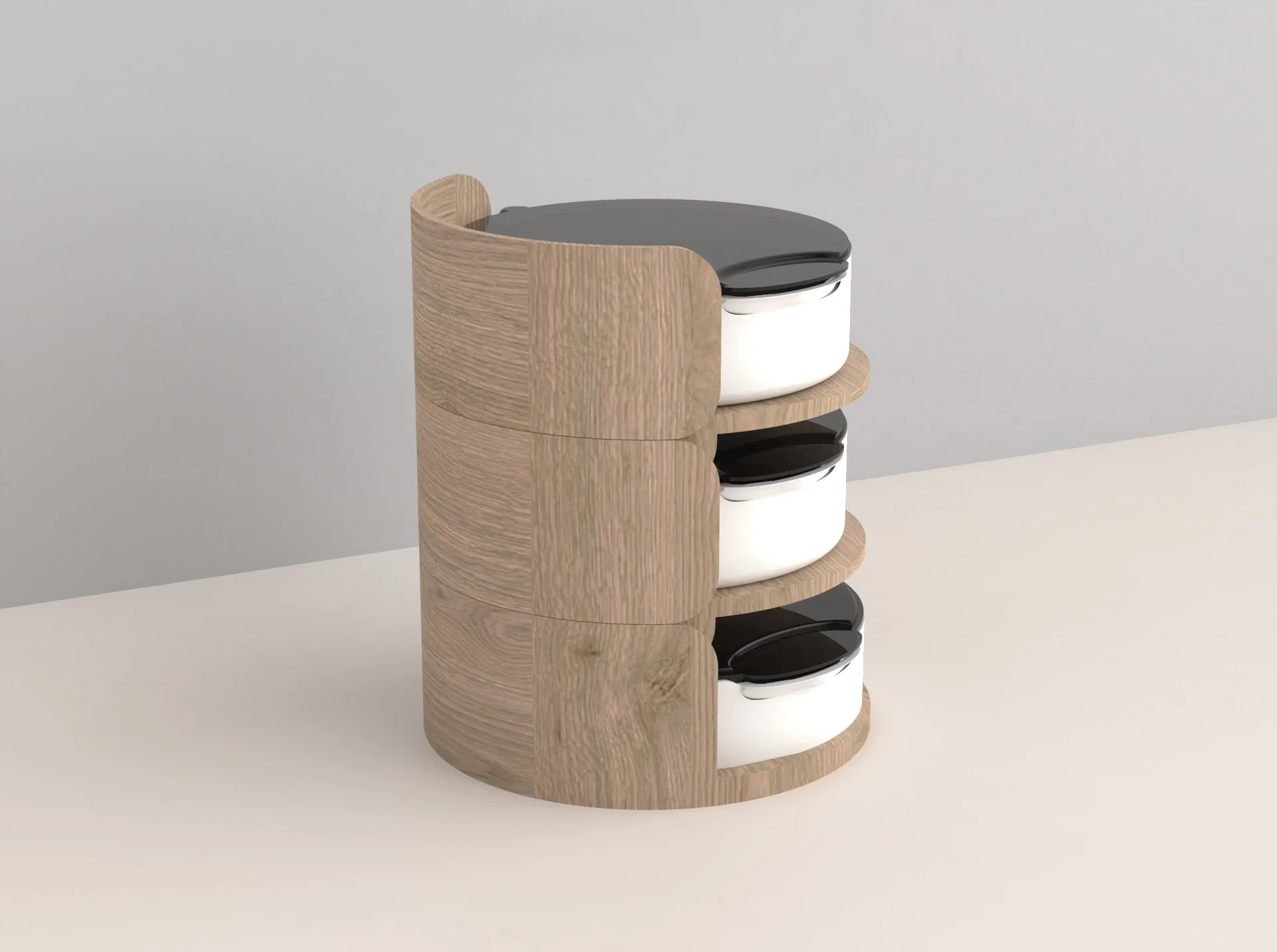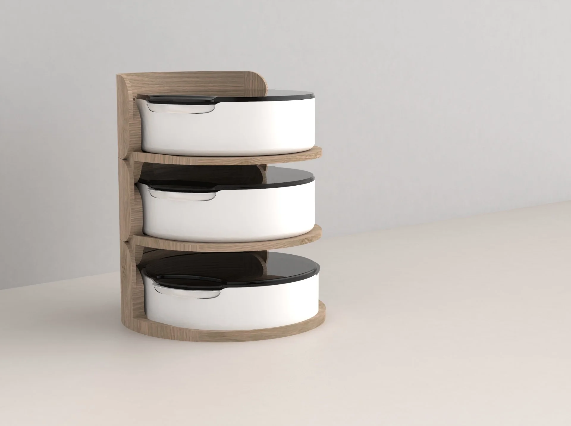 The vessel is made with porcelain so that it is easy to wash by hand or in the washing machine. Because of the material of the vessels, the user can give them a personal touch by glazing them. The lids can also be chosen in different colors to give the user their own personal product. The shelf is formed to make it easier to insert the vessels, and the vessels have an upper shape to make it easier for the user to pour out the kombucha.
